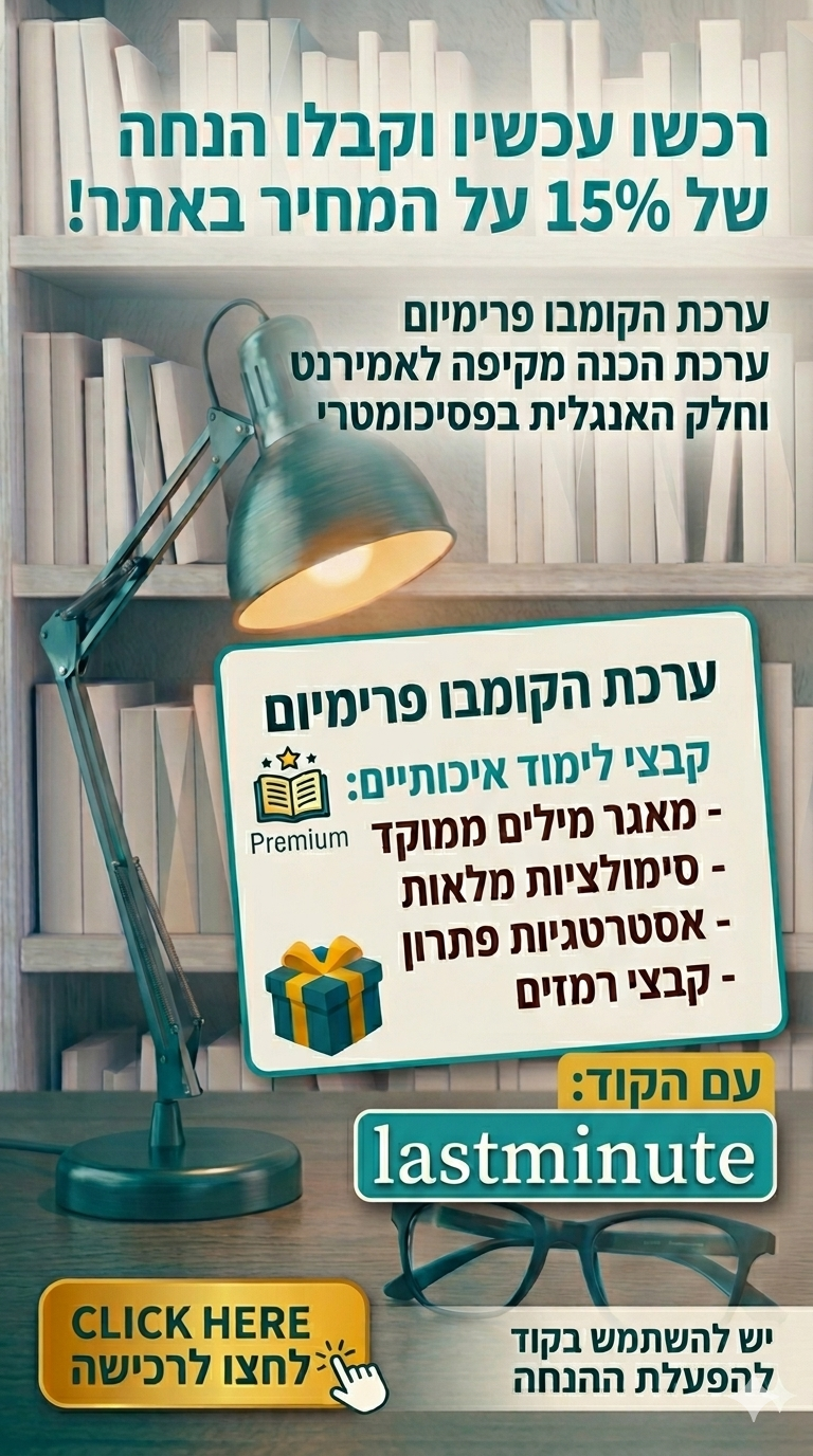 החבילה כוללת סימולציות מלאות, אוצר מילים ממוקד, טכניקות פתרון, רמזים חכמים ותרגולים מדויקים למבחן.