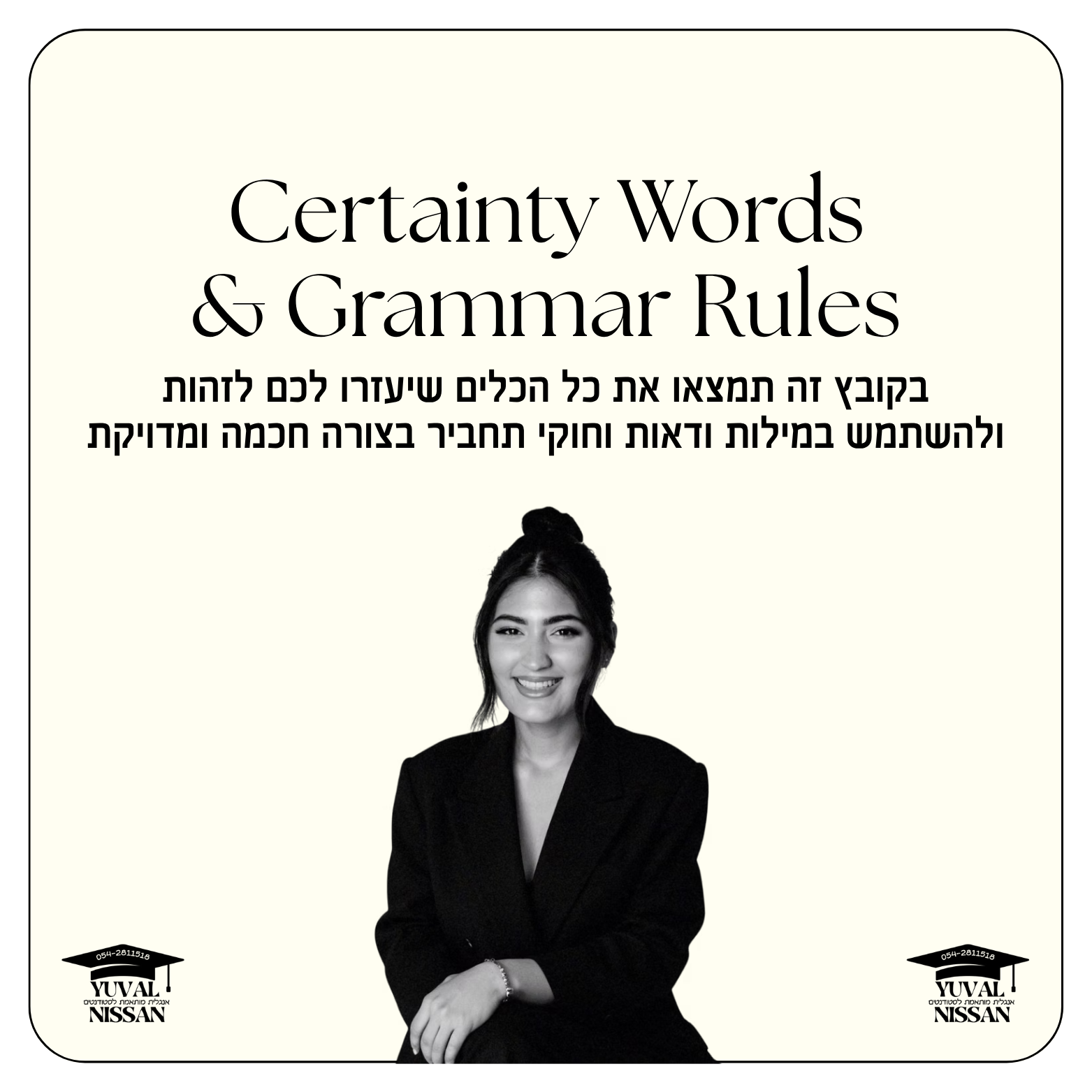 בקובץ זה תמצאו את כל הכלים שיעזרו לכם לזהות ולהשתמש במילות ודאות וחוקי תחביר בצורה חכמה ומדויקת – בדיוק כפי שנלמד בקורסים של יובל ניסן.